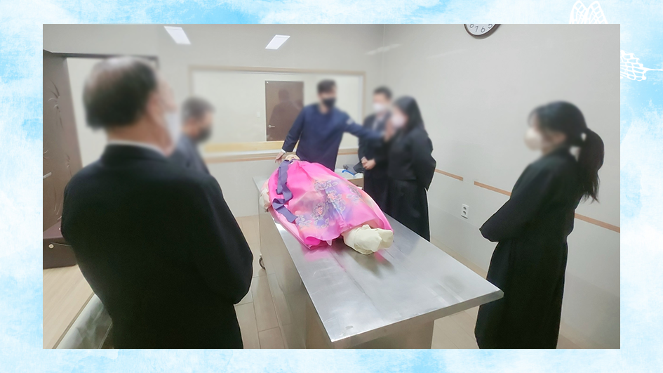 그리고 기본 수의 위에 어머님이 원하시던 한복을 정성스럽게 입혀 주셨습니다.